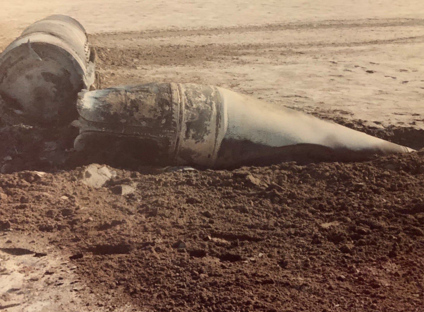 Down range, near the southern Iraqi village of Bussaya, the observers from Unit 224 scanned the horizon, looking for the arrival of the missile. When it arrived, however, something was wrong—the missile was wobbling and looked as if it had broken into two pieces. The missile pancaked onto the ground, the warhead failing to explode. The technicians from the ad hoc group were flown to the impact zone in a helicopter and examined the debris. The extended fins had broken off, and the missile had broken apart along the guidance section, between the warhead and the oxidizer tank.