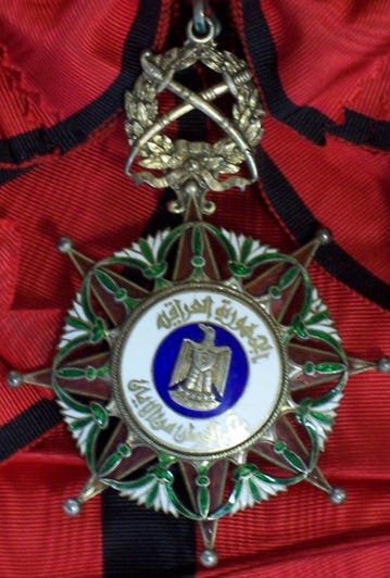 The Wissam al-Rafidain (“Order of the Two Rivers”) is named for the two great rivers of Iraq, the Tigris and Euphrates. It is the highest award that can bestowed on a military officer for service to the Republic of Iraq. The award comes in four classes; the first, or highest, is presented as a sash worn across the chest, with the second-class award suspended on a red moiré ribbon, with thin black stripes at each edge and in the center, being worn around the neck. The third and fourth classes are awarded as simple medals.