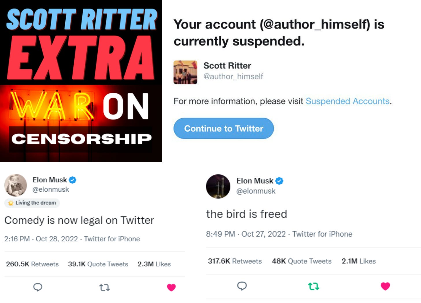 In last week’s episode of Ask the Inspector, I objected when Scott Ritter criticized Elon Musk more harshly than I felt the new Twitter owner deserves. On the other hand, I lauded Scott’s basic strategy, which is to aggressively demand immediate reinstatement rather than docilely waiting and hoping. It’s just that when Elon said he needed some time to figure out whose accounts should be restored, it seemed reasonable.